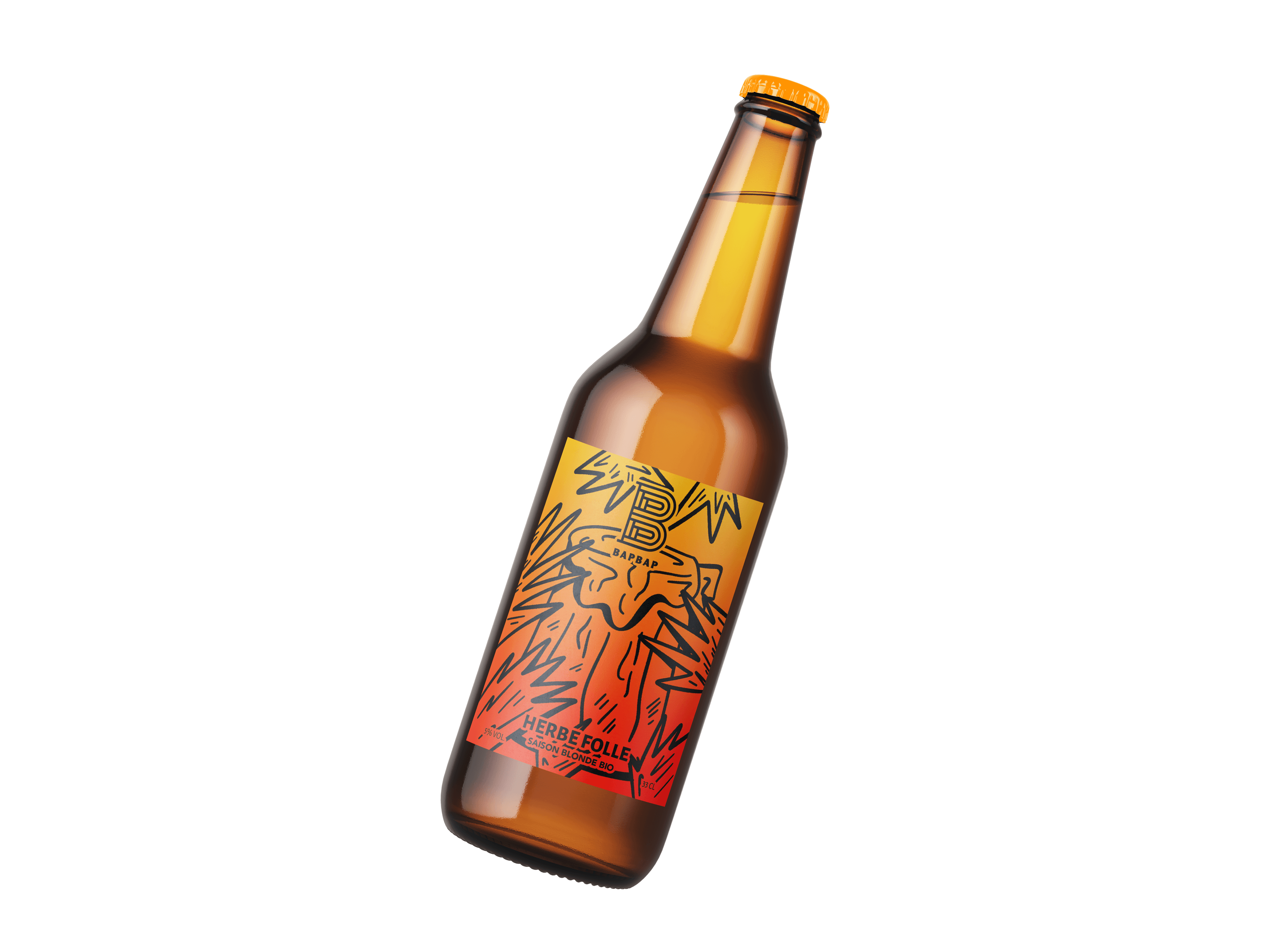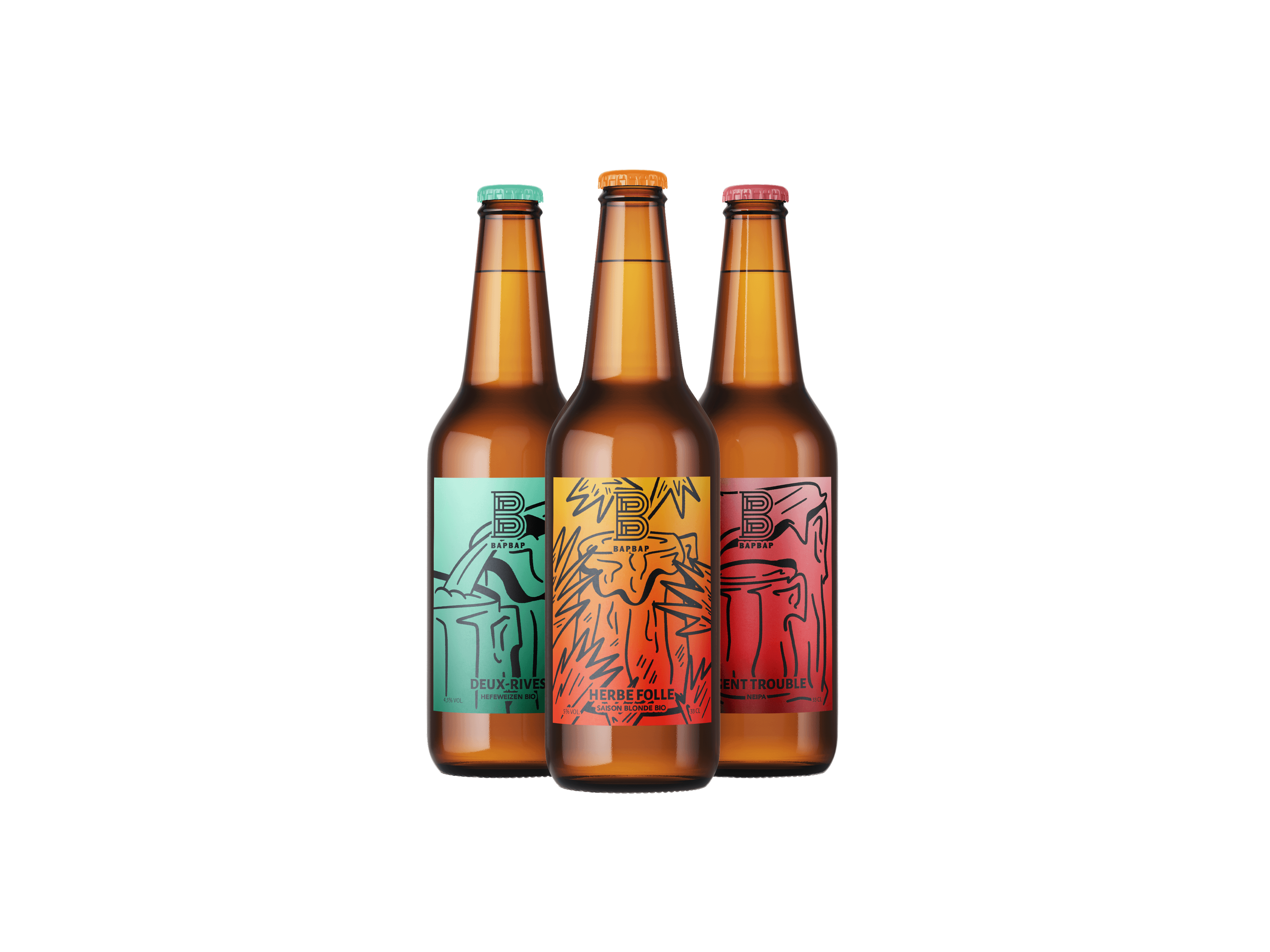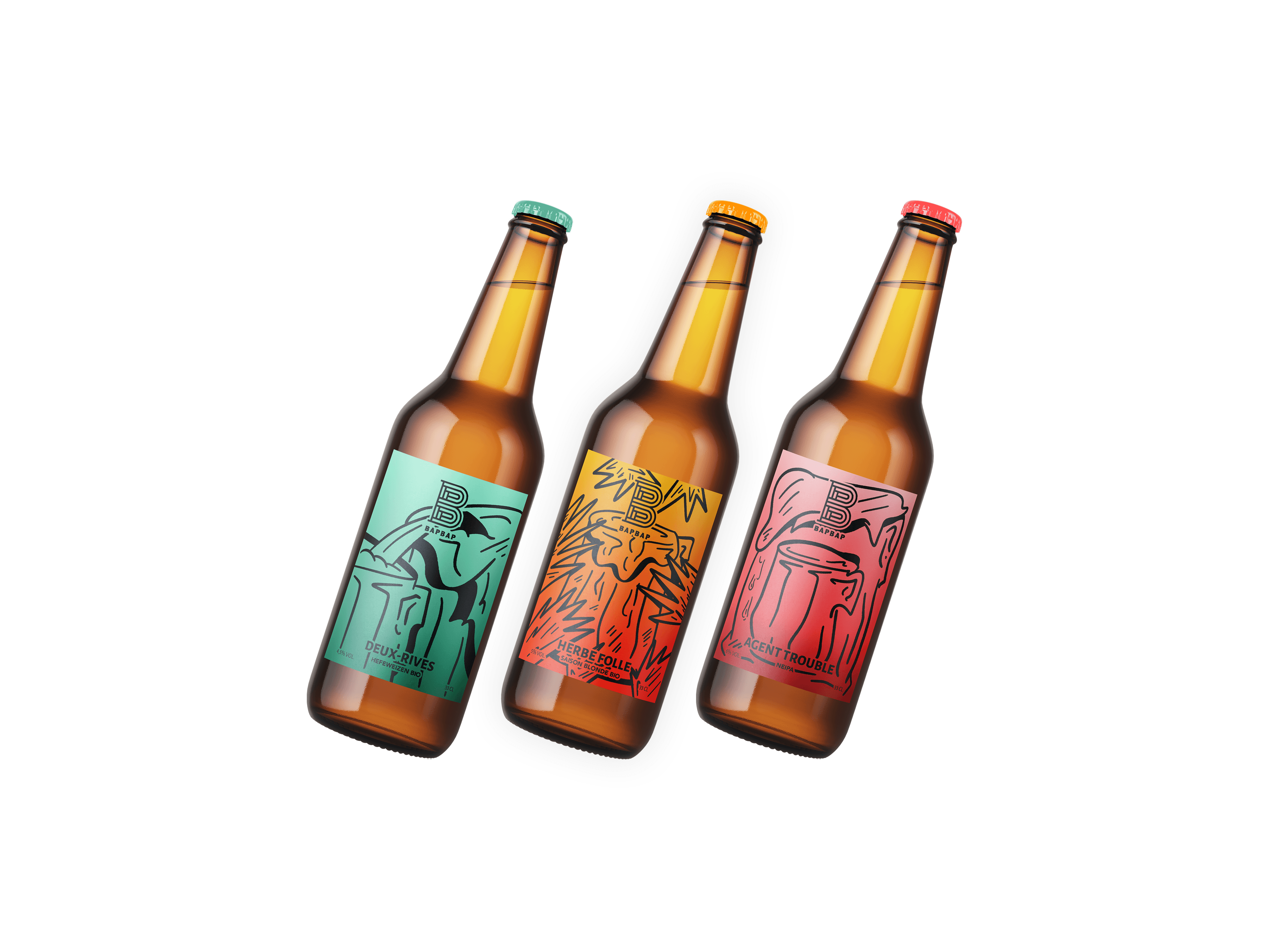 As part of a school project, I developed a playful and minimalist illustrative series for the craft beer brand BAPBAP. The project revolves around humorous anthropomorphic characters that personify the unique names of the beers: Deux-Rives, Herbe Folle, and Agent Trouble, to create a narrative storytelling experience. Inspired by the minimalist black line-art of cocktail labels, the series integrates a functional color-coding system (green, orange, and red) to subtly indicate the alcohol intensity of each brew. This approach translates complex brand names into a cohesive, poetic, and witty visual universe.