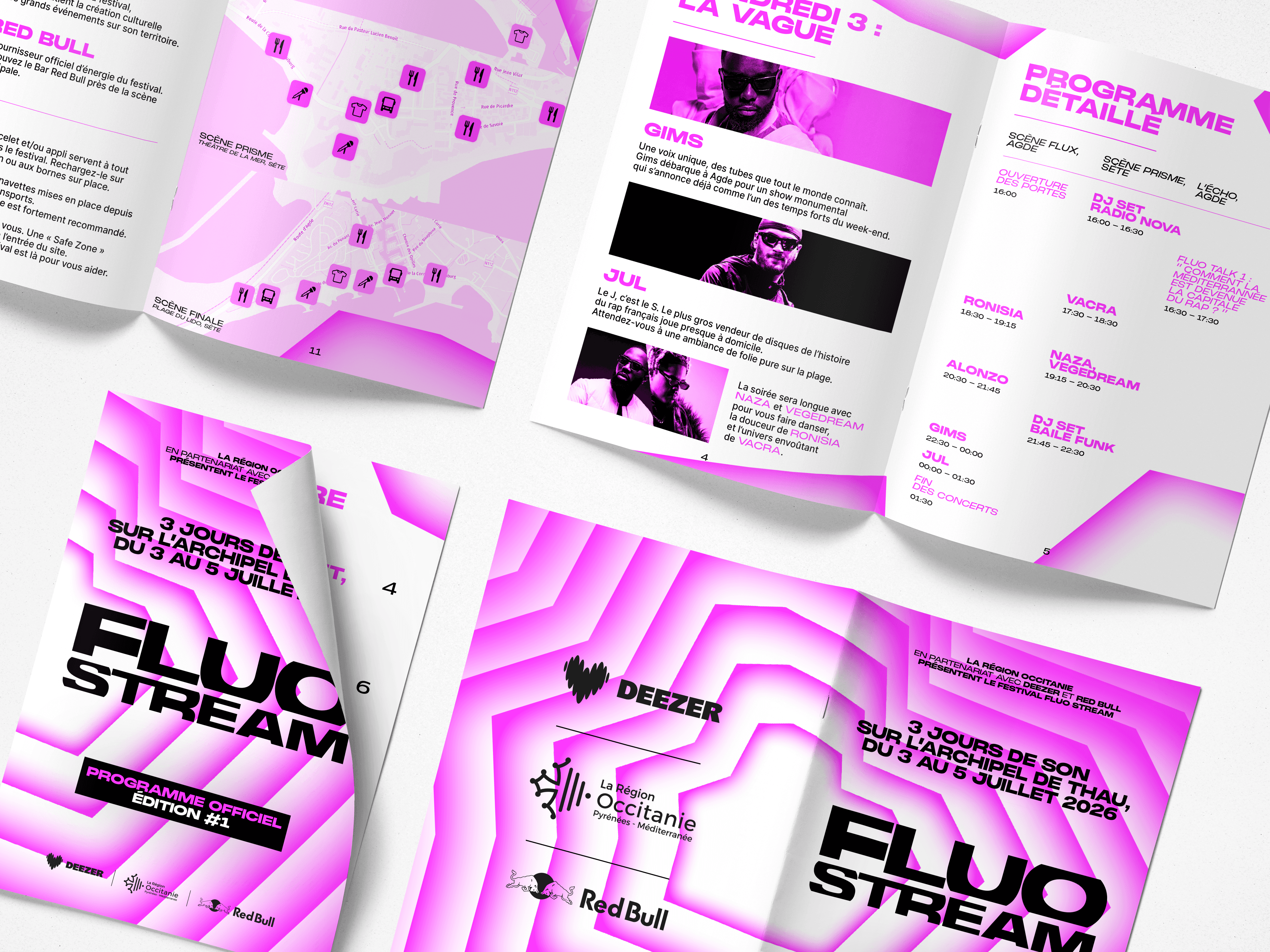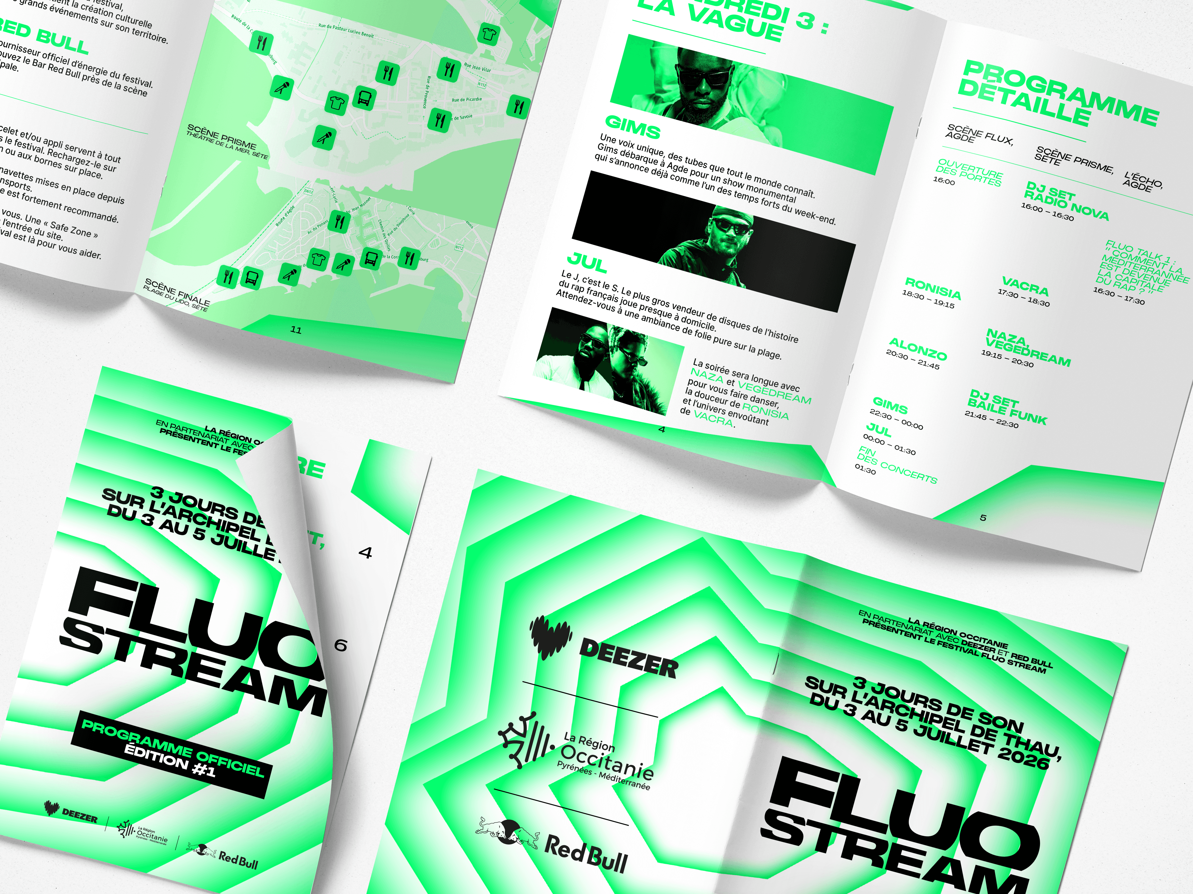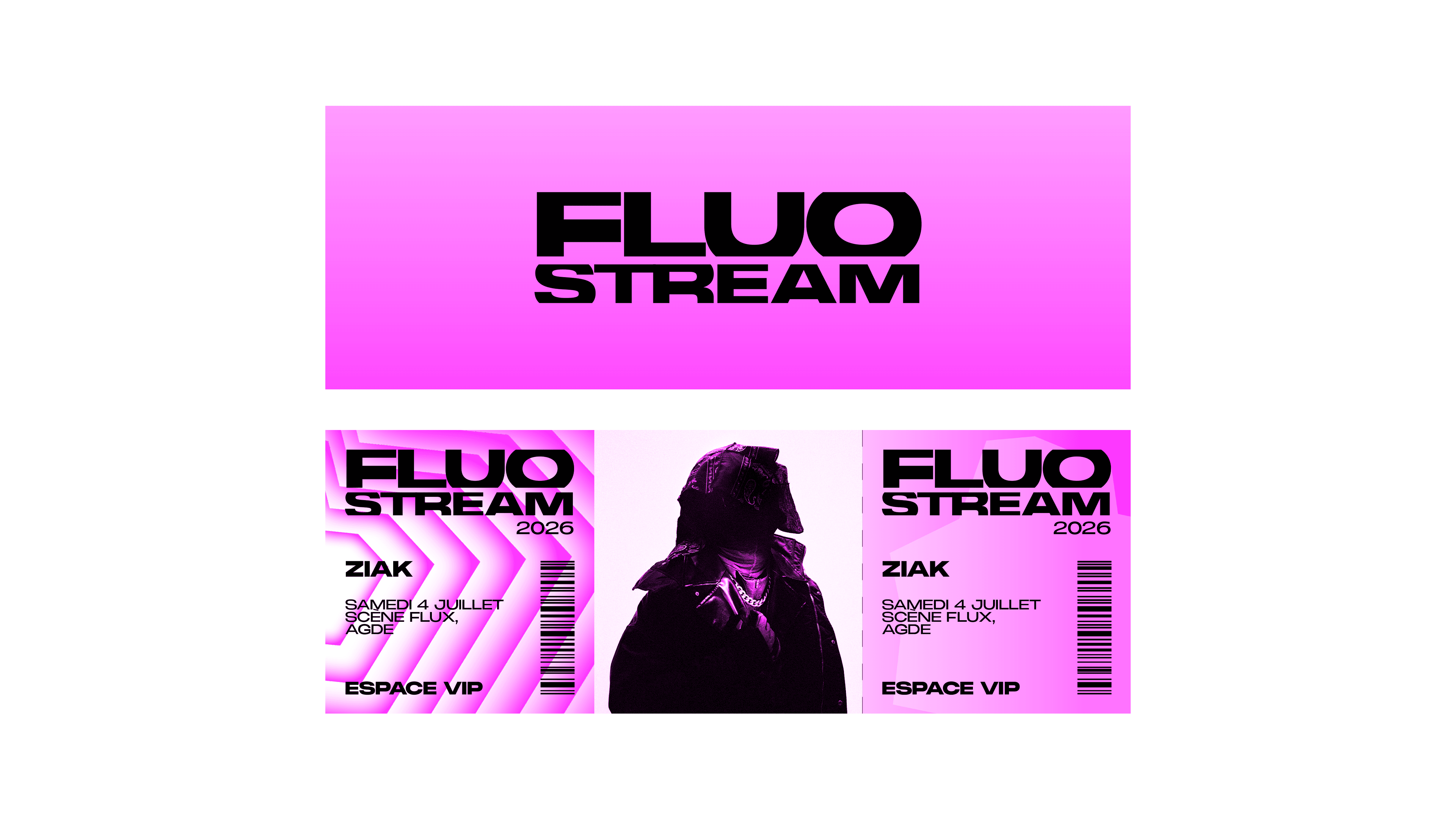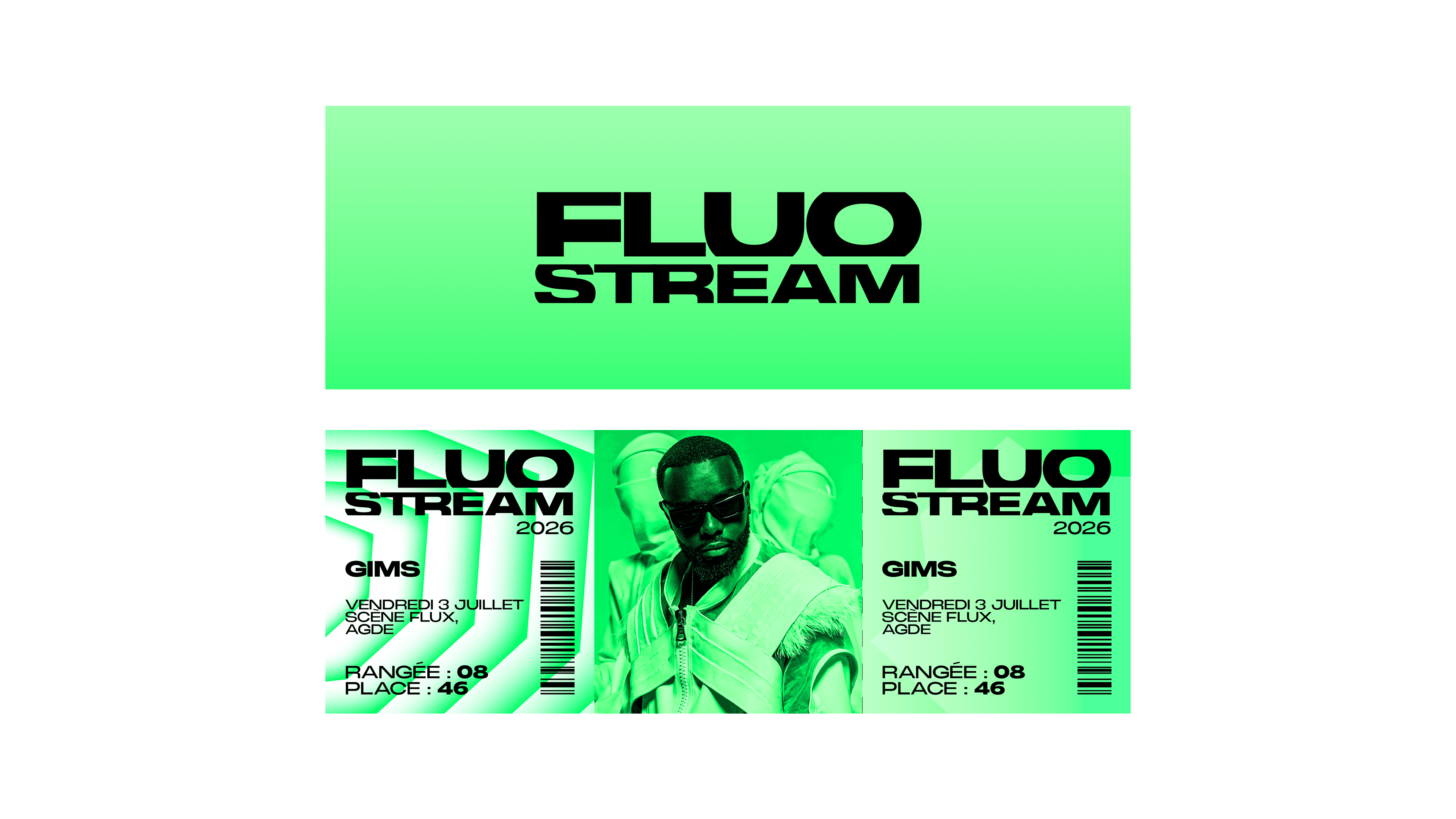 The brief called for the creation of a comprehensive visual identity for an urban music festival held on the Thau Archipelago. The name “Fluo Stream” thus embodies a dual meaning: the digital flow of music streaming characteristic of this generation, and the natural currents connecting the cities of Sète and Agde. Taking the opposite approach to the usual dark aesthetics of rap, the design adopts a clinical and luminous style inspired by the outlines of the cities of Sète and Agde.