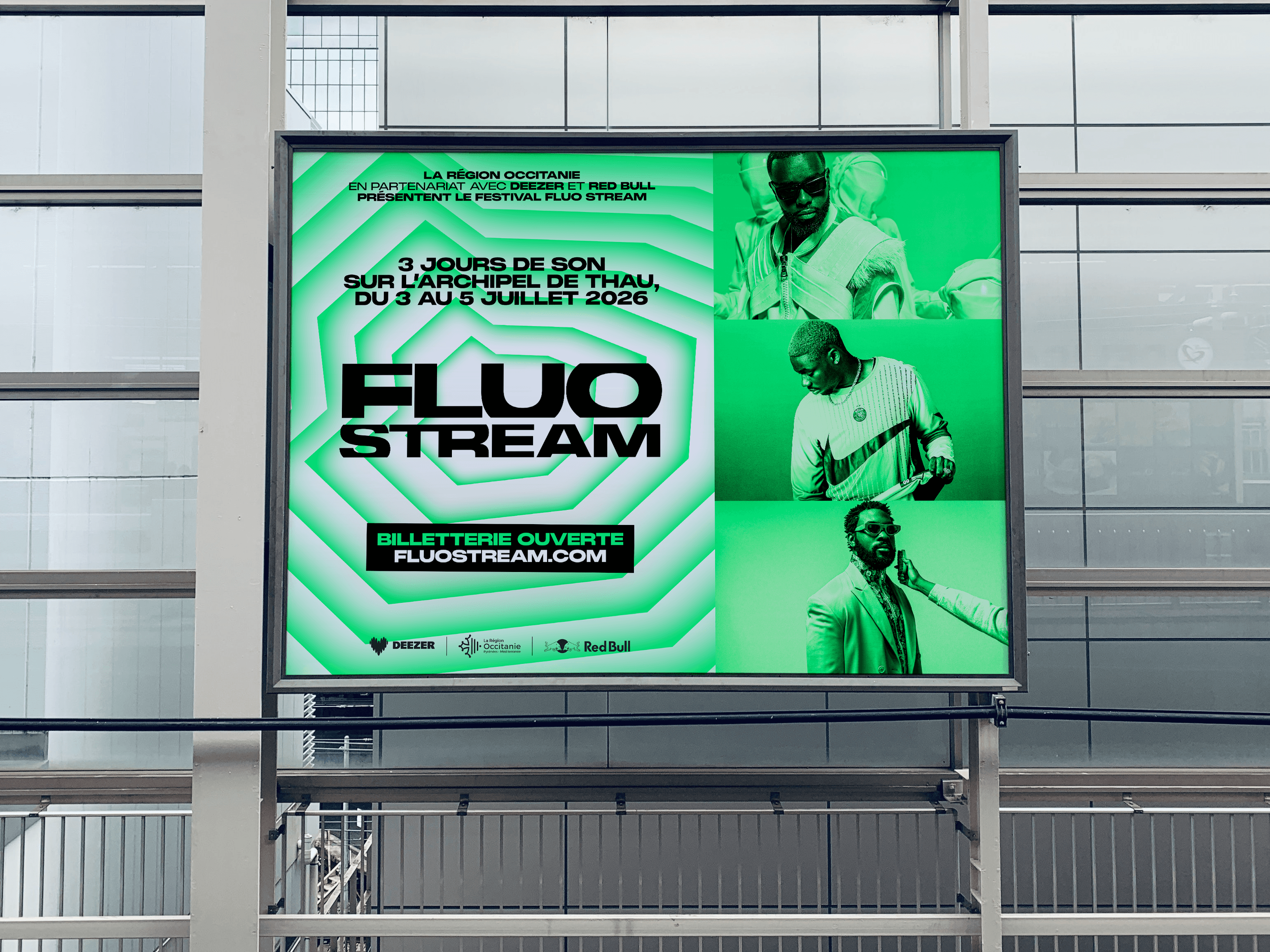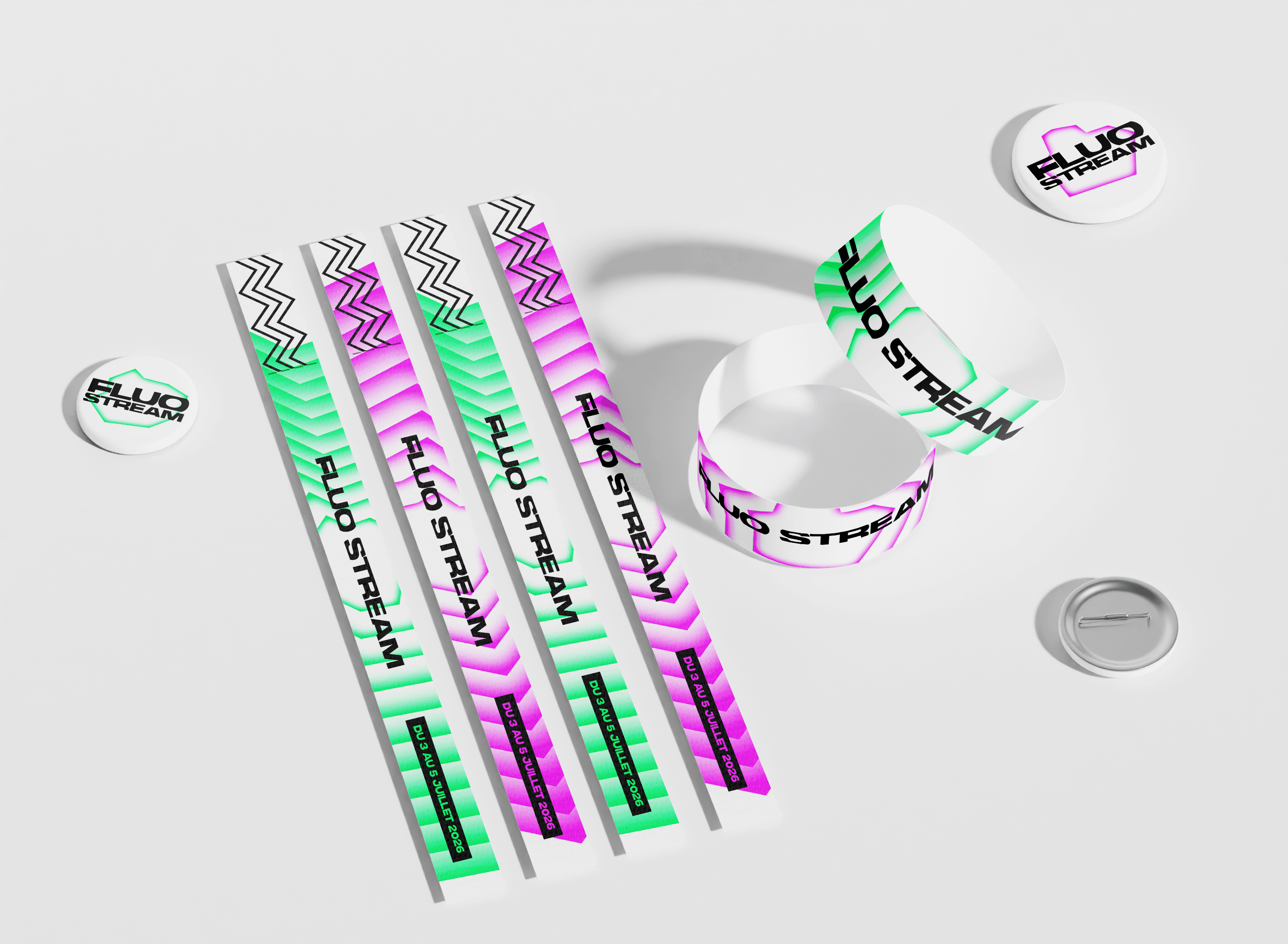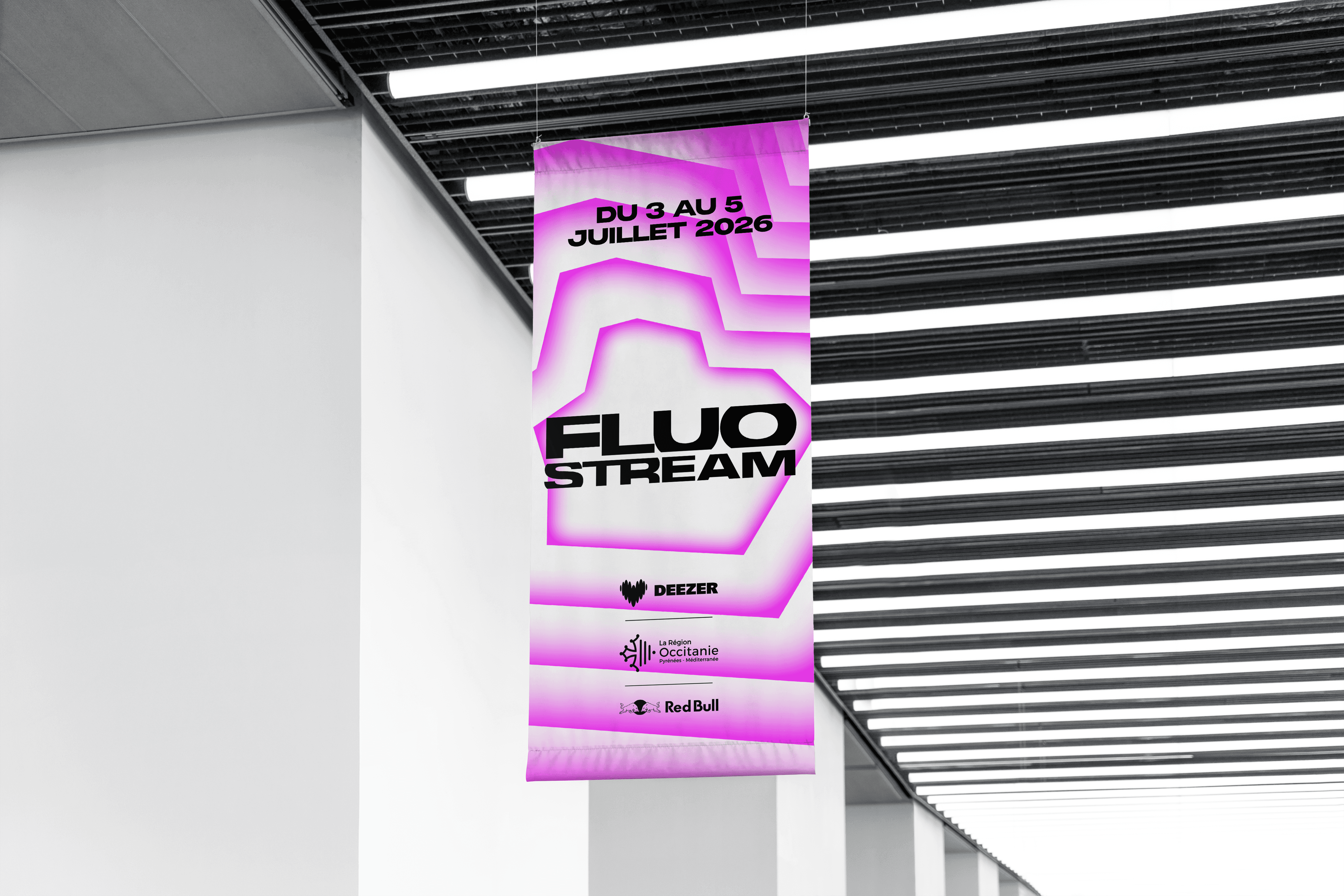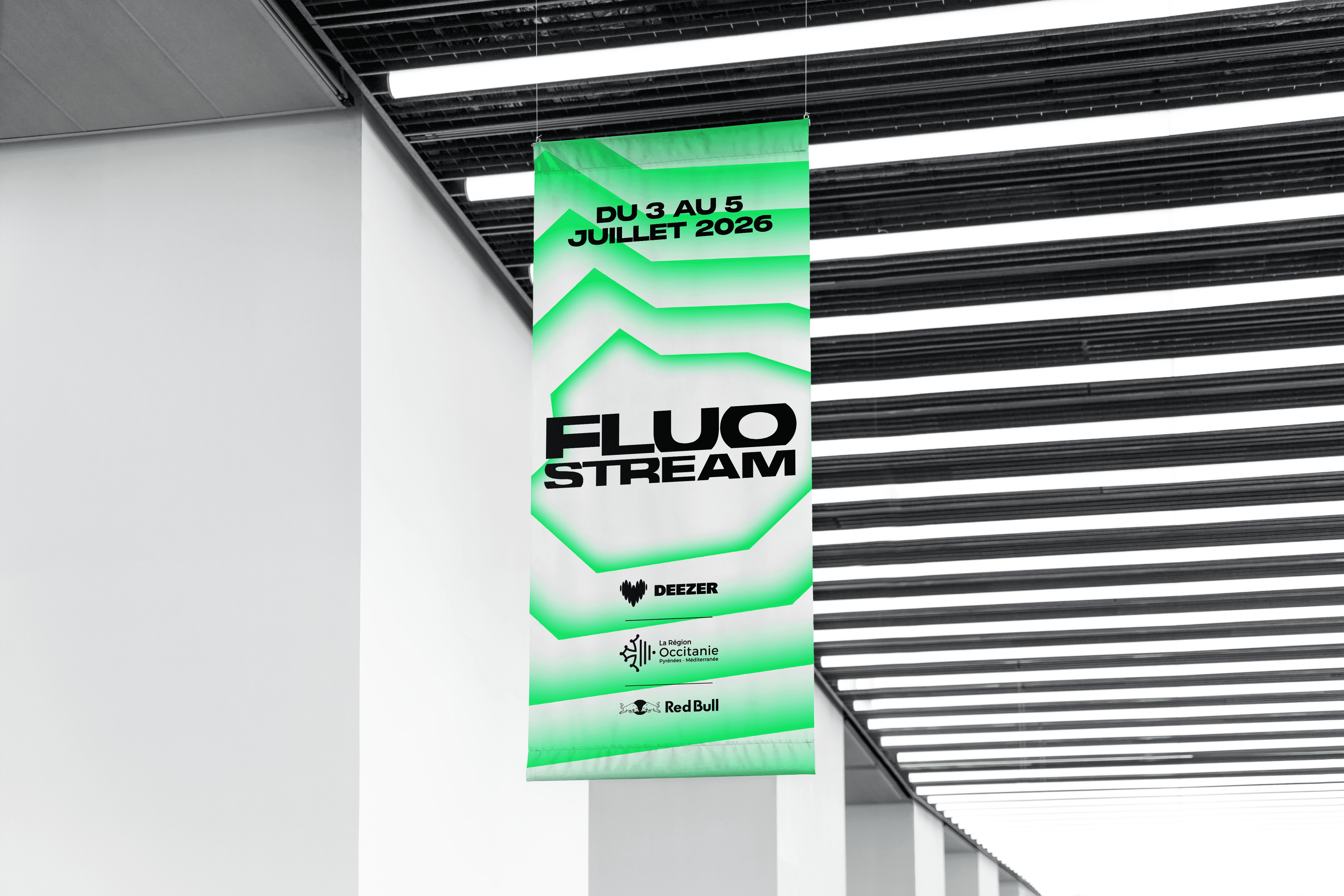 The brief called for the creation of a comprehensive visual identity for an urban music festival held on the Thau Archipelago. The name “Fluo Stream” thus embodies a dual meaning: the digital flow of music streaming characteristic of this generation, and the natural currents connecting the cities of Sète and Agde. Taking the opposite approach to the usual dark aesthetics of rap, the design adopts a clinical and luminous style inspired by the outlines of the cities of Sète and Agde.
