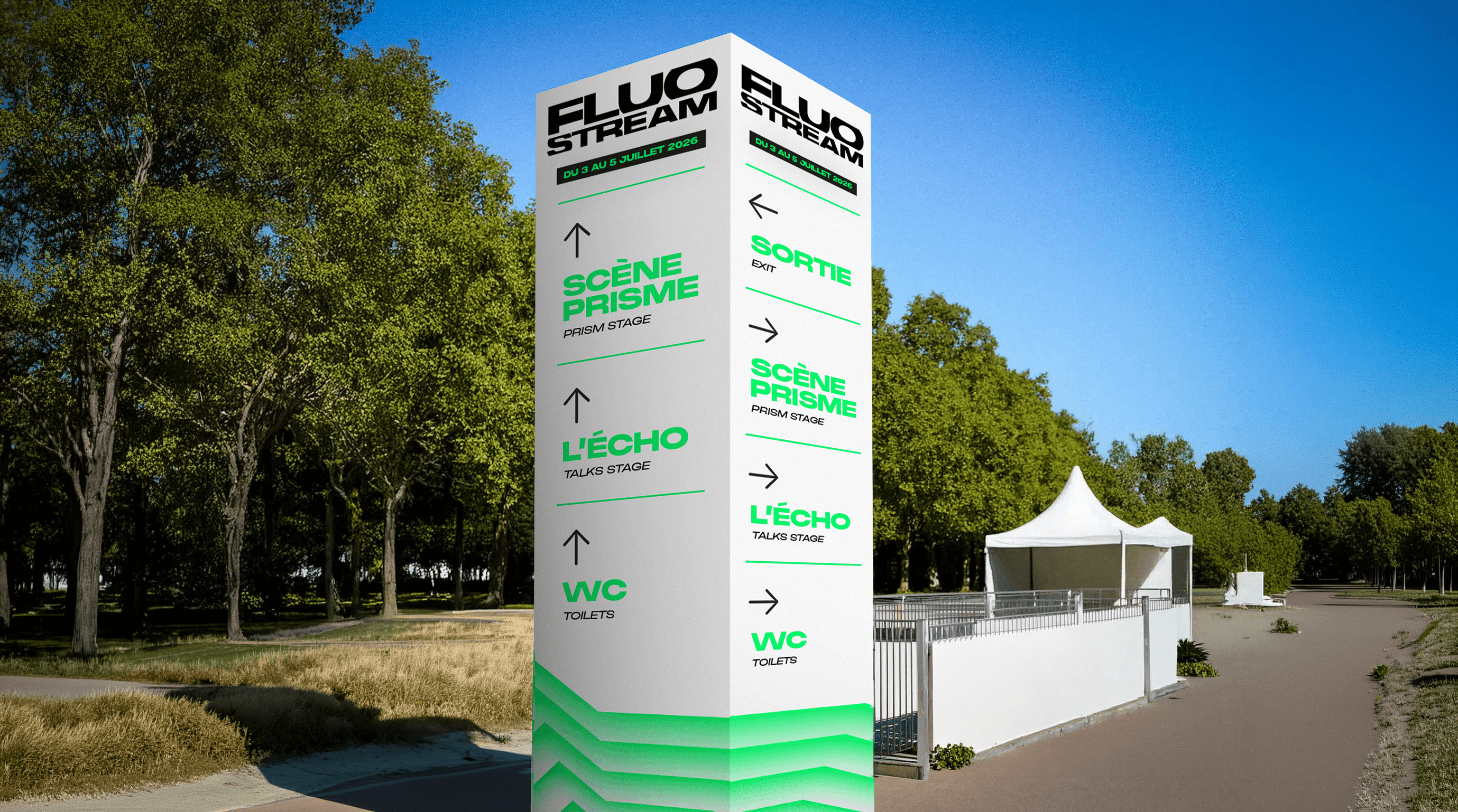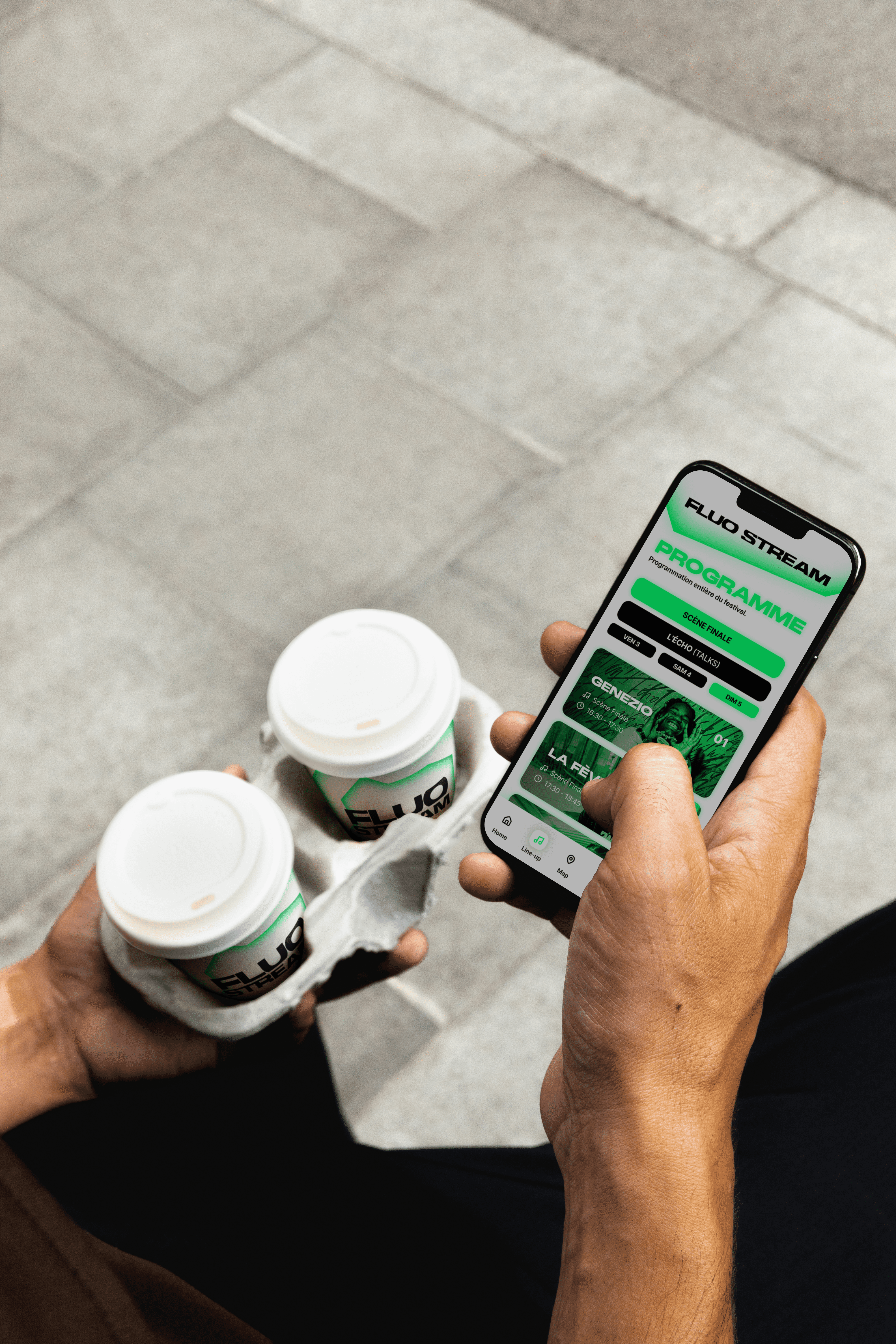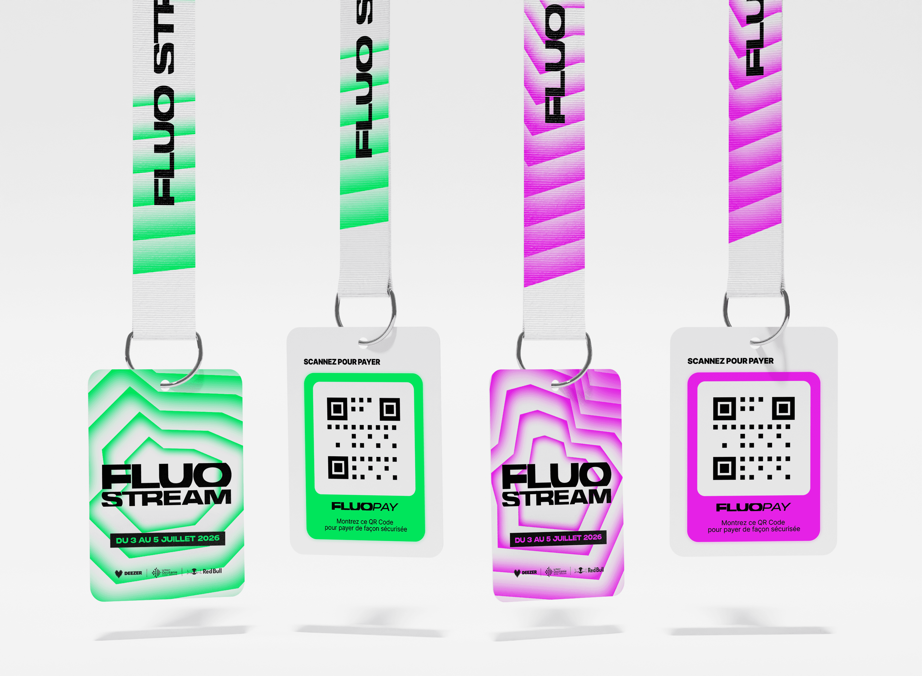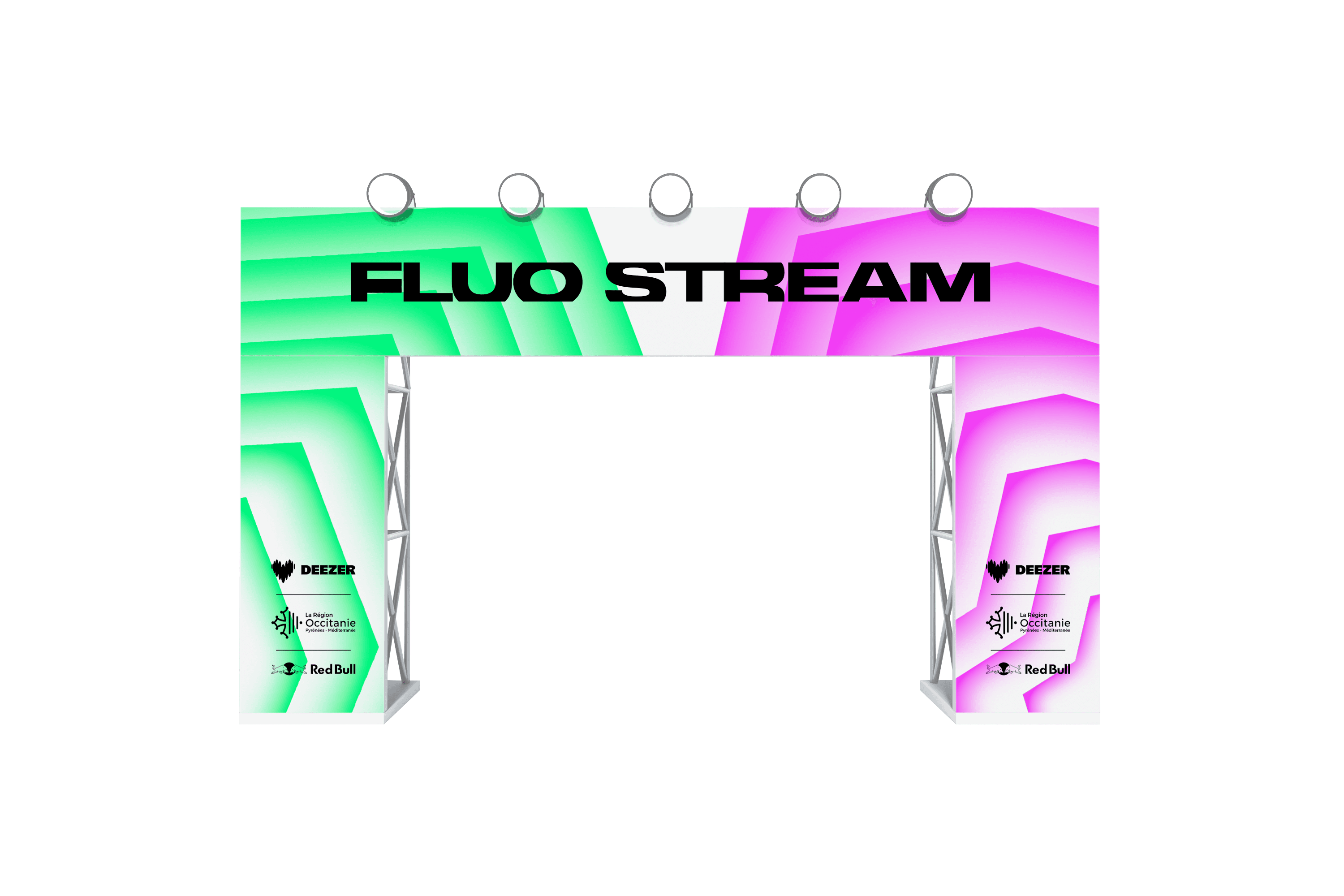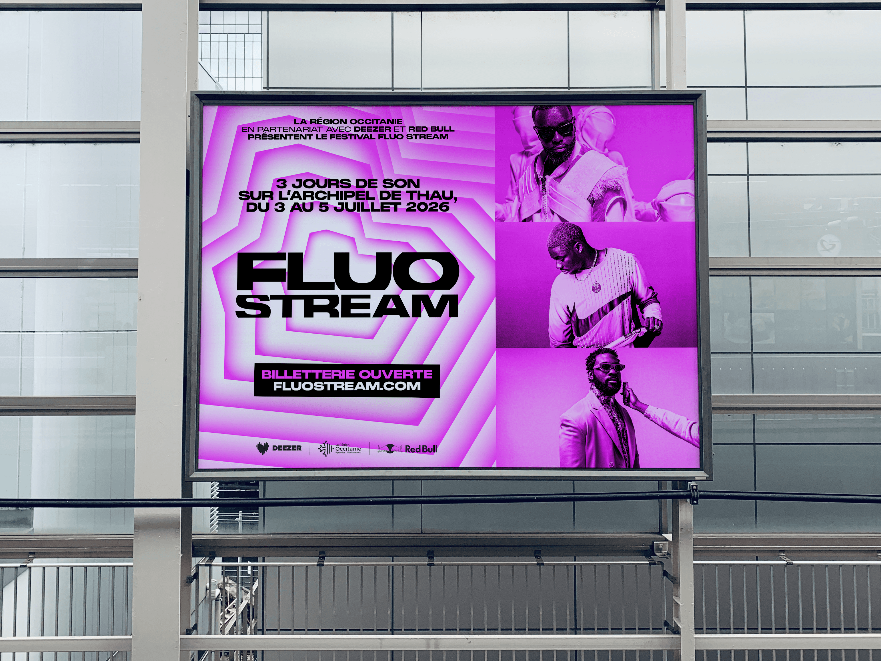 The brief called for the creation of a comprehensive visual identity for an urban music festival held on the Thau Archipelago. The name “Fluo Stream” thus embodies a dual meaning: the digital flow of music streaming characteristic of this generation, and the natural currents connecting the cities of Sète and Agde. Taking the opposite approach to the usual dark aesthetics of rap, the design adopts a clinical and luminous style inspired by the outlines of the cities of Sète and Agde.