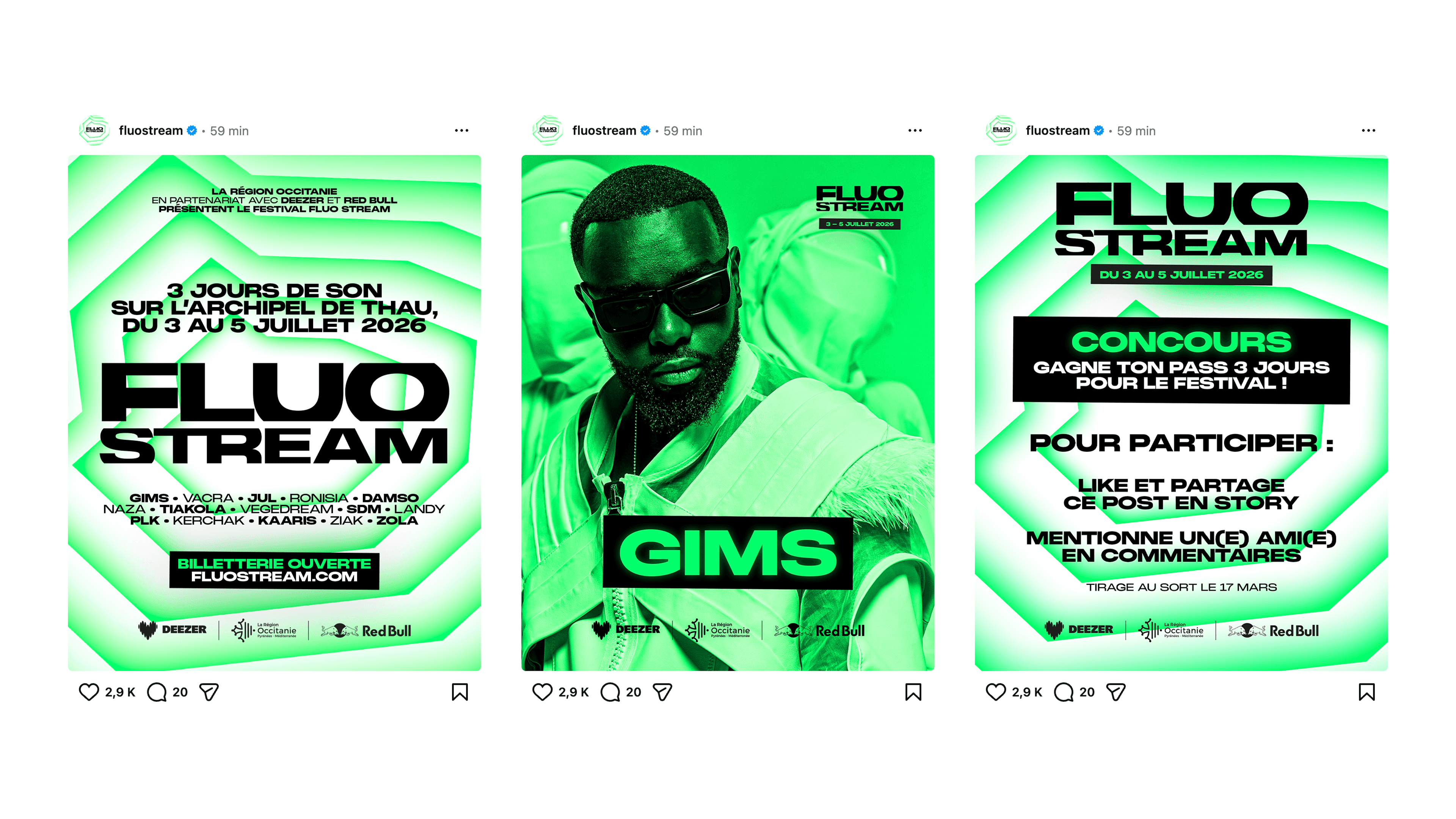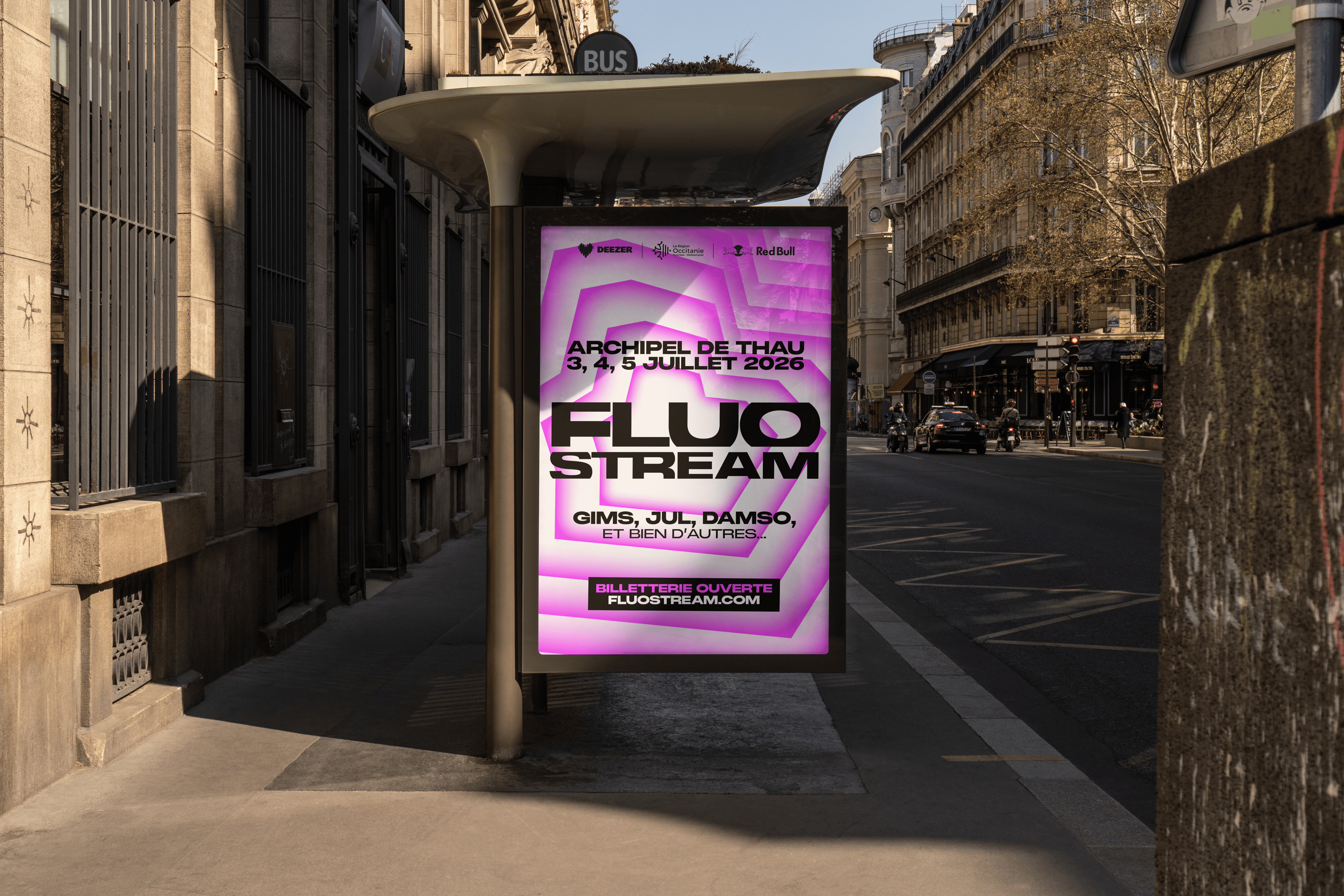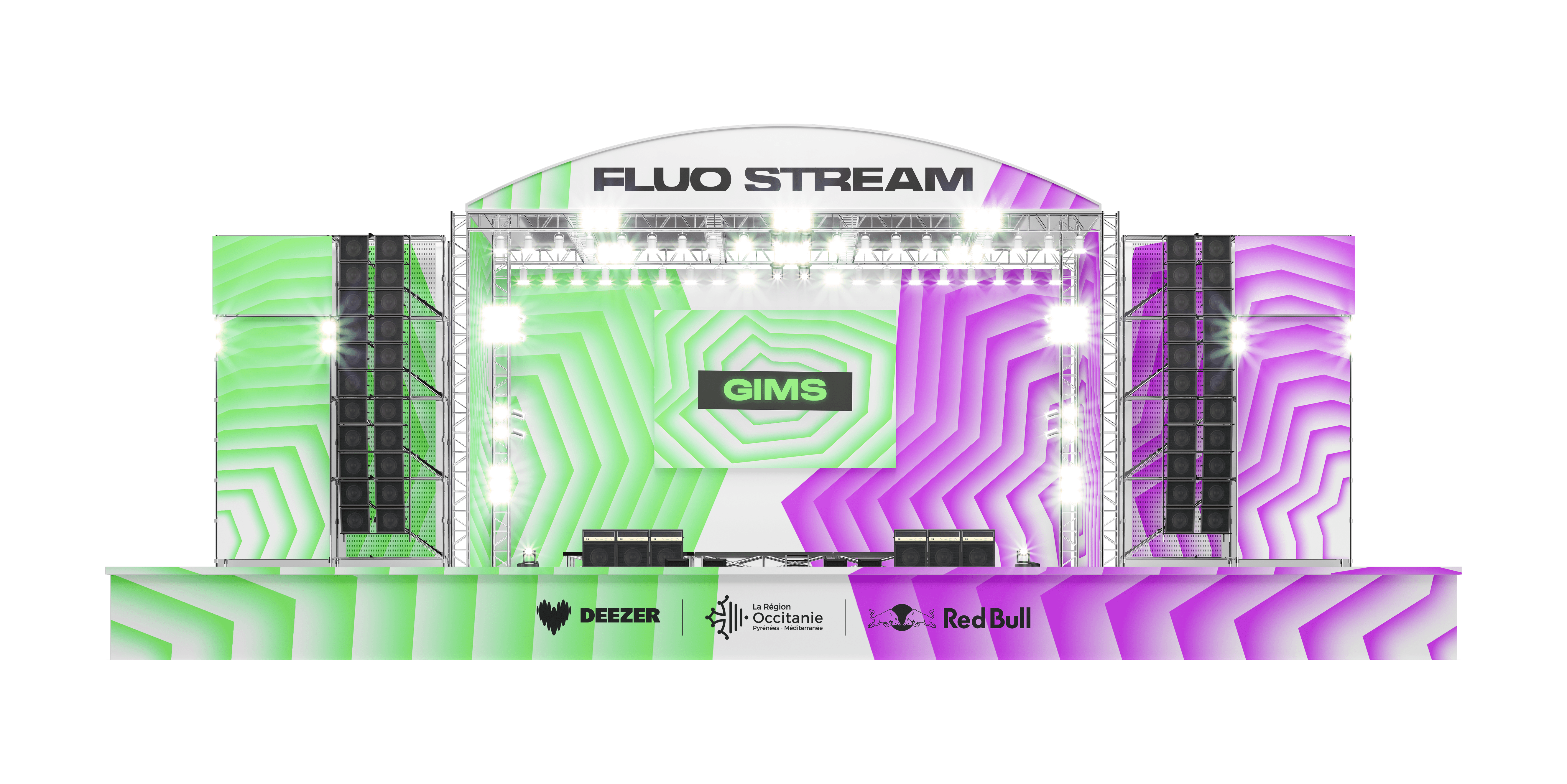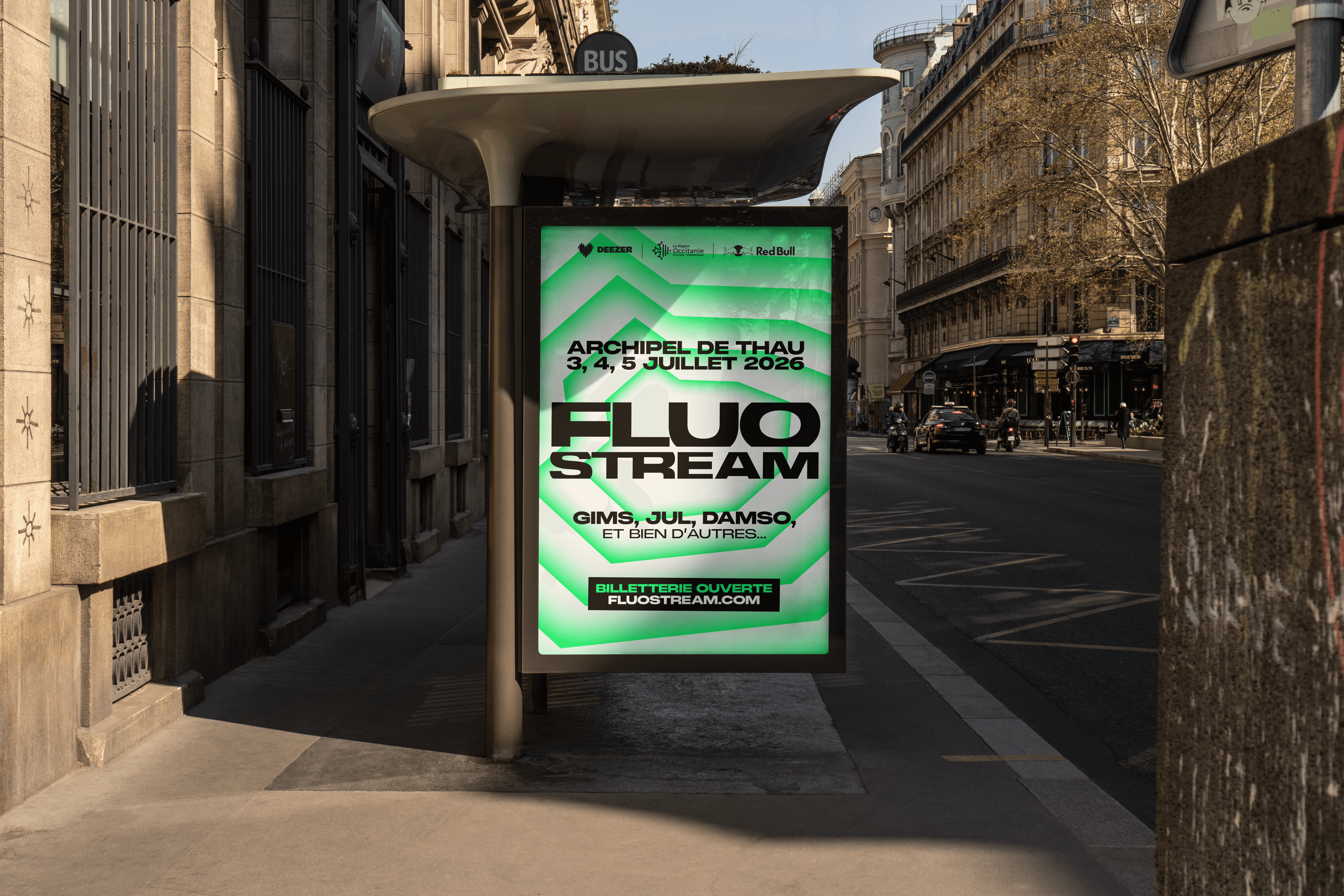 The brief called for the creation of a comprehensive visual identity for an urban music festival held on the Thau Archipelago. The name “Fluo Stream” thus embodies a dual meaning: the digital flow of music streaming characteristic of this generation, and the natural currents connecting the cities of Sète and Agde. Taking the opposite approach to the usual dark aesthetics of rap, the design adopts a clinical and luminous style inspired by the outlines of the cities of Sète and Agde.