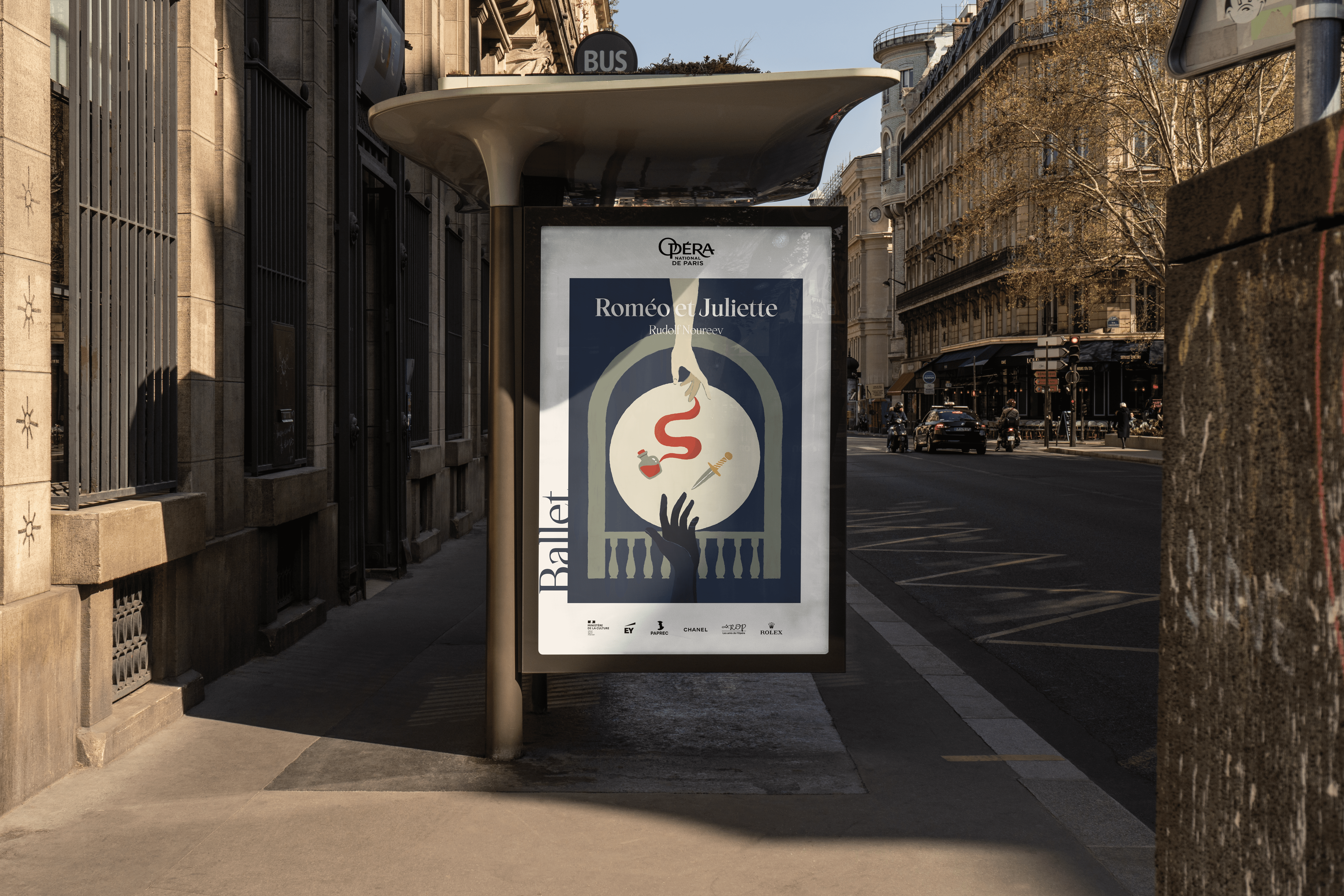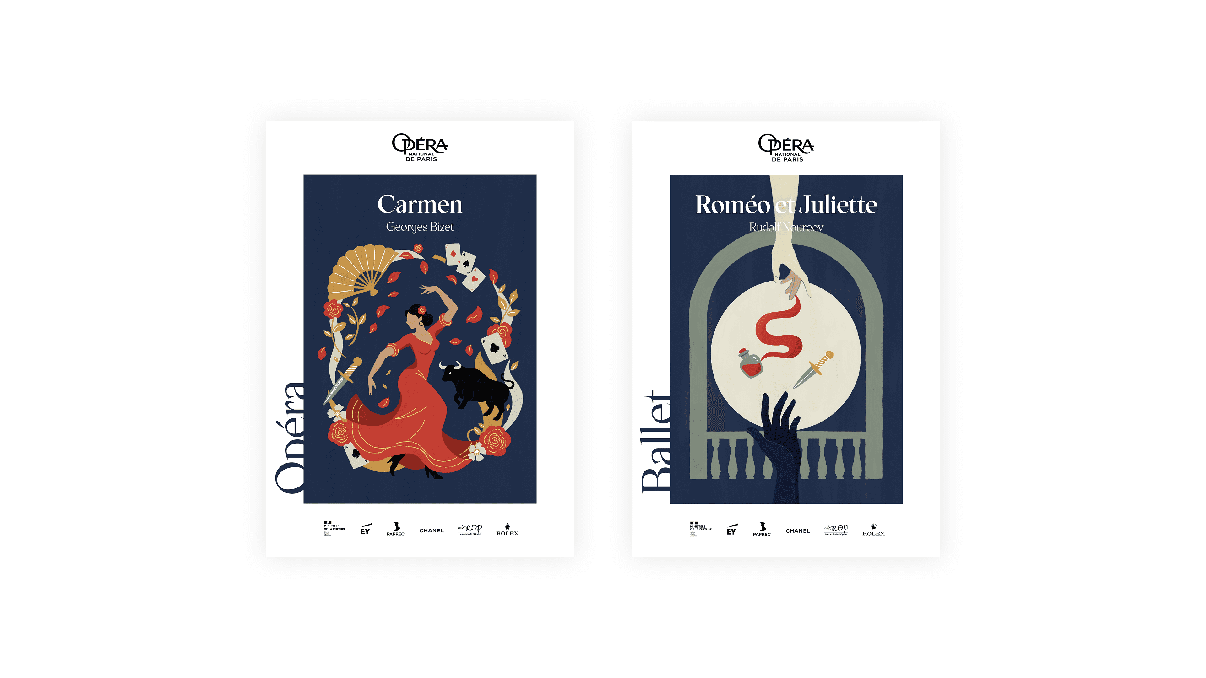 As part of a school project, I created a new illustrative identity for the Opéra national de Paris, focusing on iconic works such as Carmen and Romeo and Juliet. The project revolves around 'The Dreamlike Scene,' a series of modern editorial illustrations designed to capture the lyrical and dramatic essence of the performances. Each visual uses a dynamic composition where key symbols of the plot gravitate around a central subject, offering a rich and sophisticated narrative that reflects the prestige of the institution.