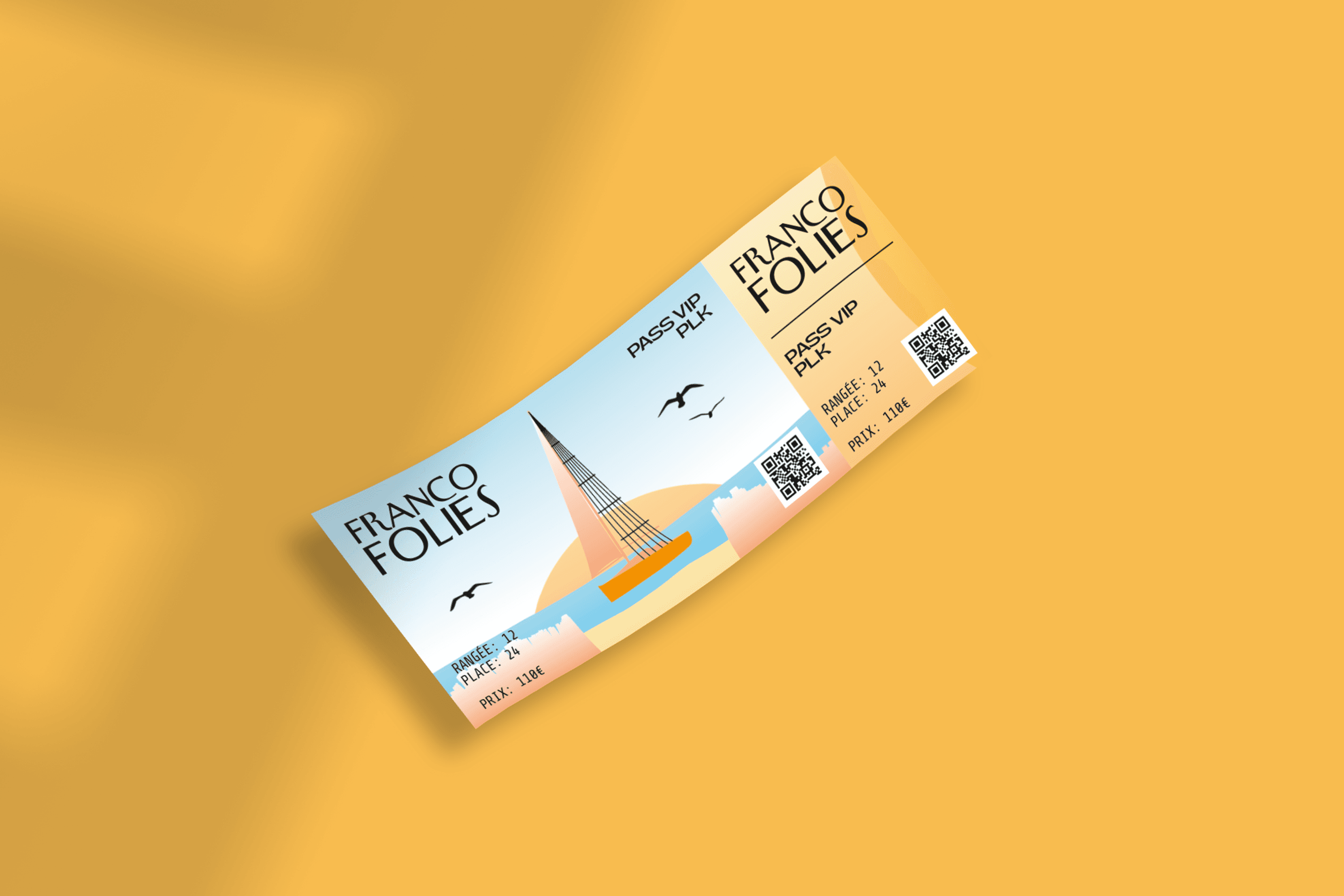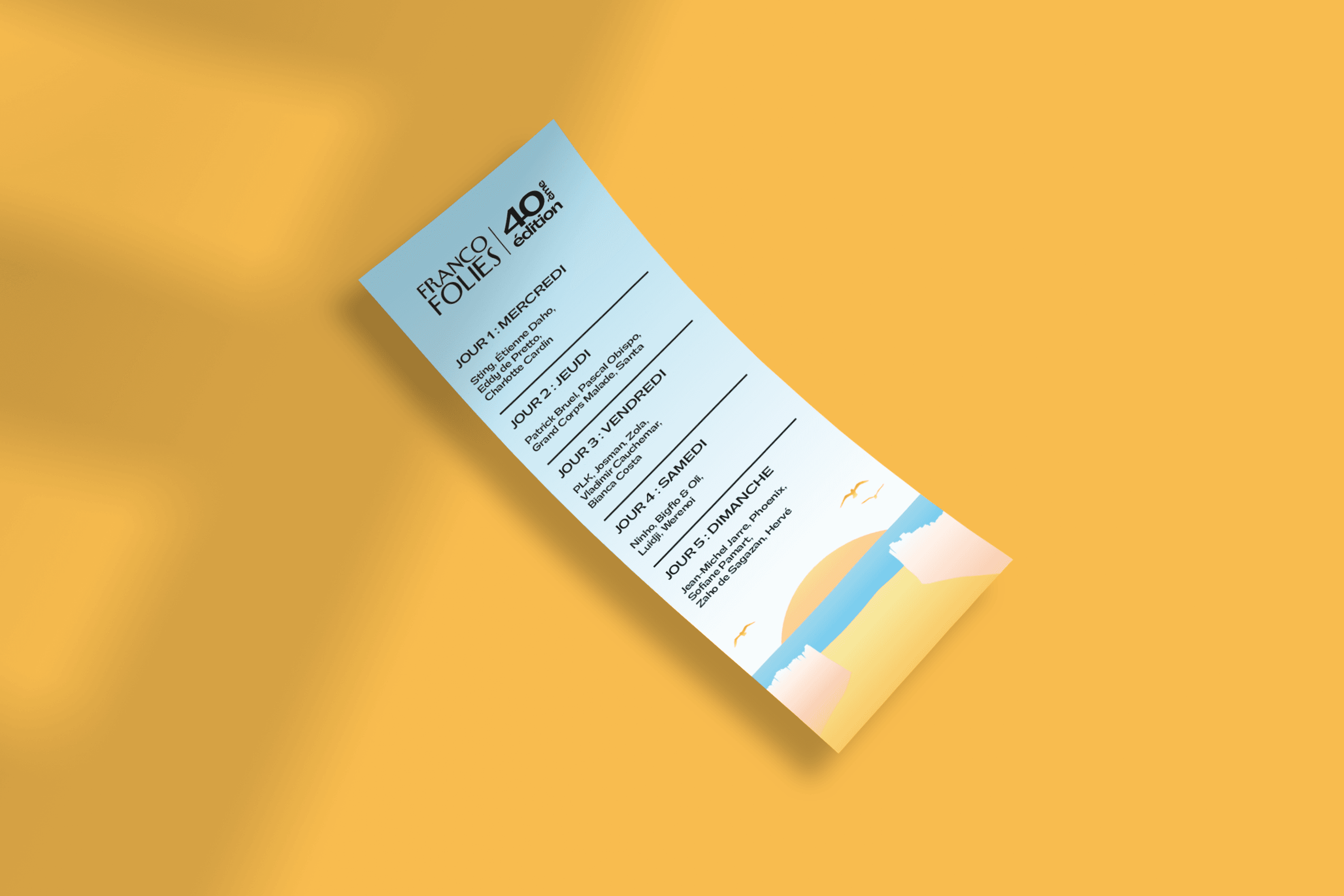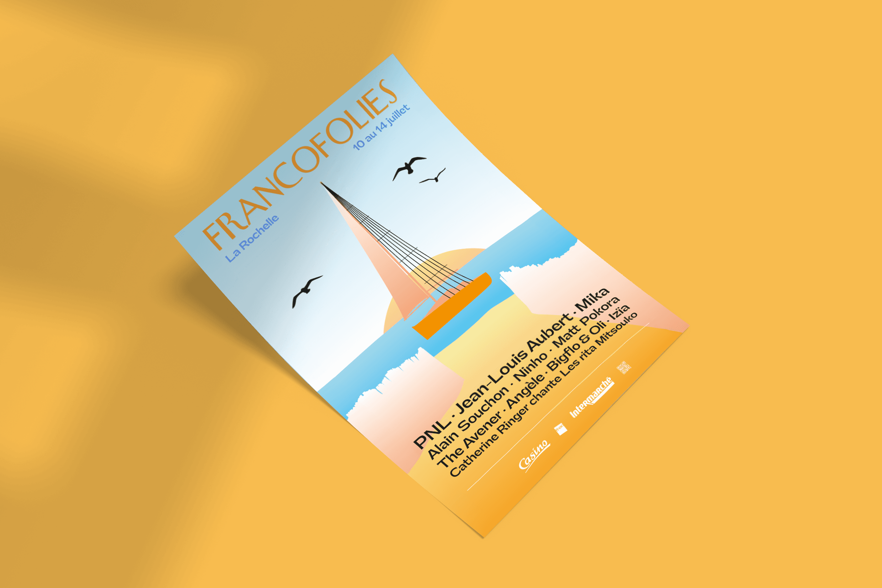 As part of a school project, I created a fictitious visual campaign on the theme of the Francofolies 2024 festival in La Rochelle. The visual campaign included an illustrated A3 poster representing the main visual of the campaign on the theme of the seaside area of La Rochelle. The boat's sail in the illustration represents the strings of a guitar, echoing the festival's musical theme.